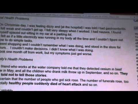 12-16-15 M2U00756 Mother from Fukushima: It was very weird… plants with huge, huge flowers and gigantic stems — I brought deformed vegetables for radiation measurement, but officials didn’t test any and yelled “Don’t you understand? We say it’s safe!” — “All the beetles were disfigured and died http://bit.ly/1RT5Mik I brought our disfigured vegetables to the municipal office for radiation testing. I was yelled at there, “Don’t you understand? We say it’s safe! Mothers must not act like that!” They never tested my vegetables. Another Unplanned Outage at Indian Point 3 http://bit.ly/1Nqz70r SHUT INDIAN POINT NOW! http://bit.ly/1m3hyKD NY Nuclear Power Plant Shut Down http://bit.ly/1m3hzOH Indian Point Nuke Plant Emergency Shutdown Follows Power Loss http://bit.ly/1Nqz9FM http://bit.ly/1RT5NCX http://bit.ly/1RT5NCX Cows tested for radiation in Fukushima 'difficult-to-return' zones http://bit.ly/1RT5NCX Unused plutonium deteriorating at Monju http://bit.ly/1N3LJYj http://bit.ly/1RT5NCY http://bit.ly/1RT5NCX http://bit.ly/1NVP1QB http://bit.ly/1PuiPW0 https://www.youtube.com/edit?o=U&video_id=f5ARdYk0FGk http://bit.ly/1Nqz9FN http://bit.ly/1RT5Mir http://bit.ly/1moBic8... Isotope Half life Mass of 1 Curie Specific activity (Ci/g) 232Th 1.405×1010 years 9.1 tonnes 1.1×10−7 (110,000 pCi/g, 0.11 µCi/g) 238U 4.471×109 years 2.977 tonnes 3.4×10−7 (340,000 pCi/g, 0.34 µCi/g) 40K 1.25×109 years 140 kg 7.1×10−6 (7,100,000 pCi/g, 7.1 µCi/g) 235U 7.038×108 years 476 kg 2.1×10−6 (210,000 pCi/g, 0.21 µCi/g) 129I 15.7×106 years 5.66 kg 0.00018 99Tc 211×103 years 58 g 0.017 239Pu 24.11×103 years 16 g 0.063 240Pu 6563 years 4.11 g 0.24 226Ra 1601 years 1.01 g 0.99 241Am 432.6 years 0.286 g 3.43 14C 5730 years 0.22 g 4.5 238Pu 88 years 54 mg 18.5 137Cs 30.17 years 12 mg 83 90Sr 28.8 years 7.2 mg 139 241Pu 14 years 8.3 mg 121.2 60Co 1925 days 883 μg 1132 210Po 138 days 223 μg 4484 3H 12.32 years 103.6 μg 9708 131I 8.02 days 8 μg 125000 123I 13 hours 0.5 μg 2000000 http://bit.ly/1NxQCd4 The typical human body contains roughly 0.1 μCi (14 mg) of naturally occurring potassium-40. A human body containing 16 kg of carbon (see Composition of the human body) would also have about 24 nanograms or 0.1 μCi of carbon-14. Together, these would have an activity of approximately 2×0.1 μCi or 7400 decays (mostly from beta decay and rarely from gamma decay) per second inside the person's body. 800-CDC-INFO | (800-232-4636) | TTY: (888) 232-6348 Regional Poison Control Centers: 1-800-222-1222 http://bit.ly/1moBicb... FBI -- WARNING -- Federal law allows citizens to reproduce, distribute or exhibit portions of copyright motion pictures, video tapes, or video disks under certain circumstances without authorization of the copyright holder. This infringement of copyright is called fair use and is allowed for purposes of criticism, news reporting, teaching and parody. USE: This site may contain copyrighted material the use of which has not always been specifically No copyright infringement is ever intended. FAIR authorized by the copyright owner. I am making such material available in a effort to advance the understanding of environmental, political, human rights, economic, democracy, scientific, and social justice issues, etc... I believe this constitutes a 'fair use' of any such copyrighted material as provided for in section 107 of the US Copyright Law. In accordance with Title 17 U.S.C. Section 107, the material on this site is distributed without profit to those who have expressed a prior interest in receiving the included information for research and educational purposes. If any individual wishes to go beyond the fair use law, they should contact the copyright owner for permission.